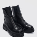 Mena Hakiki Deri Küt Burunlu Ön Kısımda Fermuar Aksesuarlı Kadın Bot- SİYAH