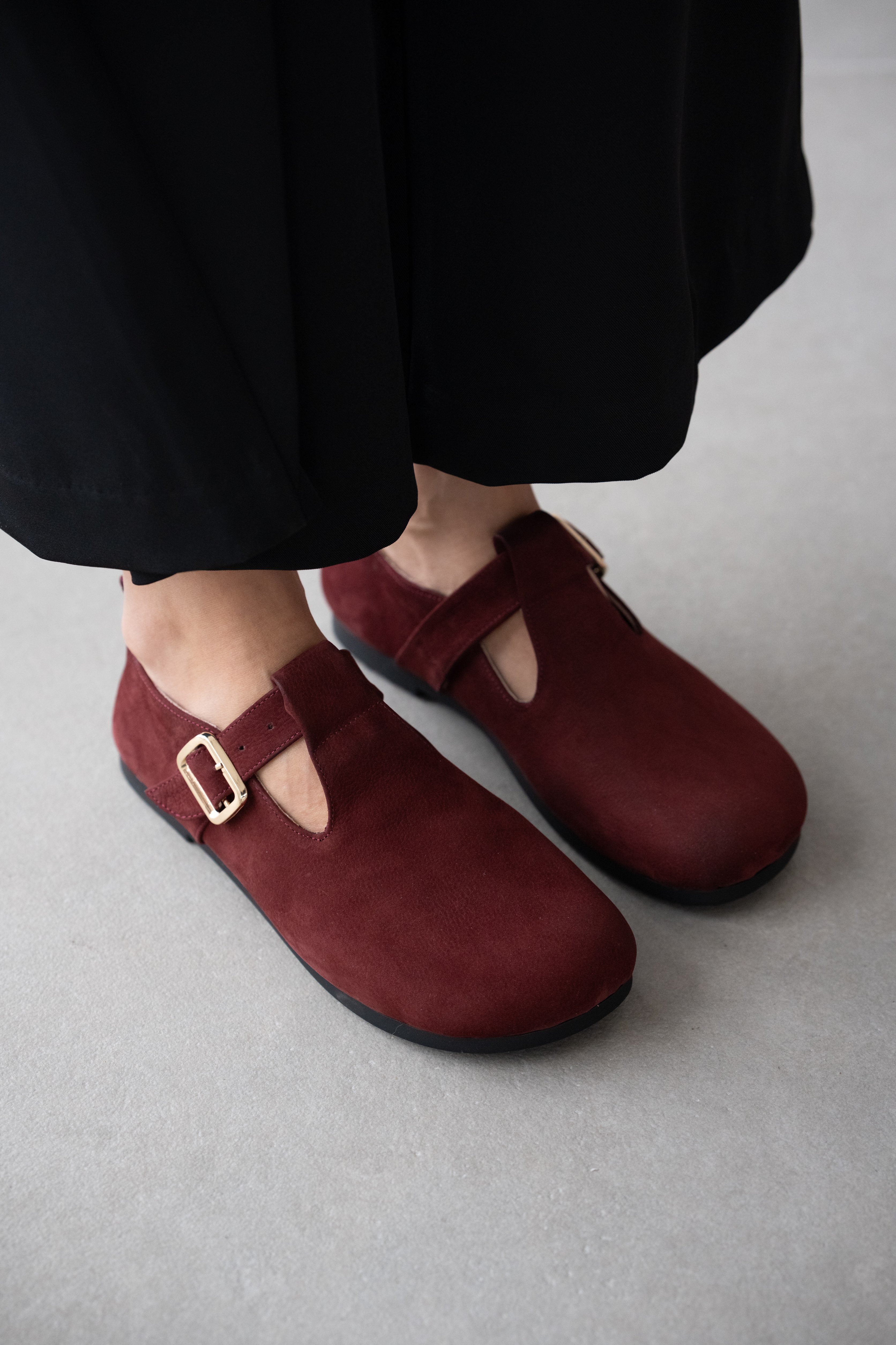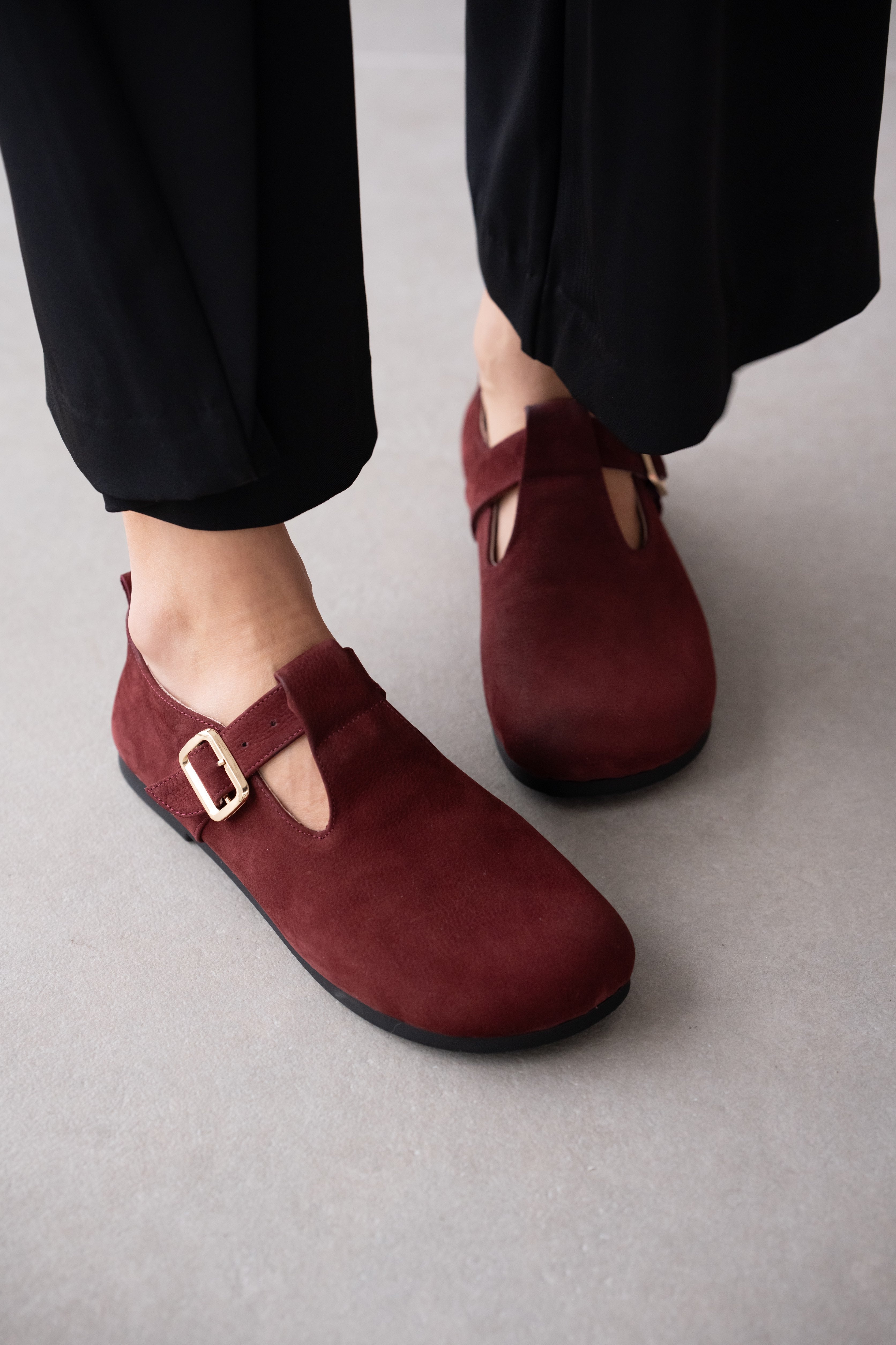 Elvior Hakiki Deri Gold Ayarlanabilir Toka Detaylı Kadın Ayakkabı- BORDO SÜET ( 0461 )