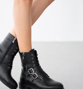 Davine Hakiki Deri Bağcık ve Toka Detaylı Yandan Fermuarlı Kadın Bot- SİYAH