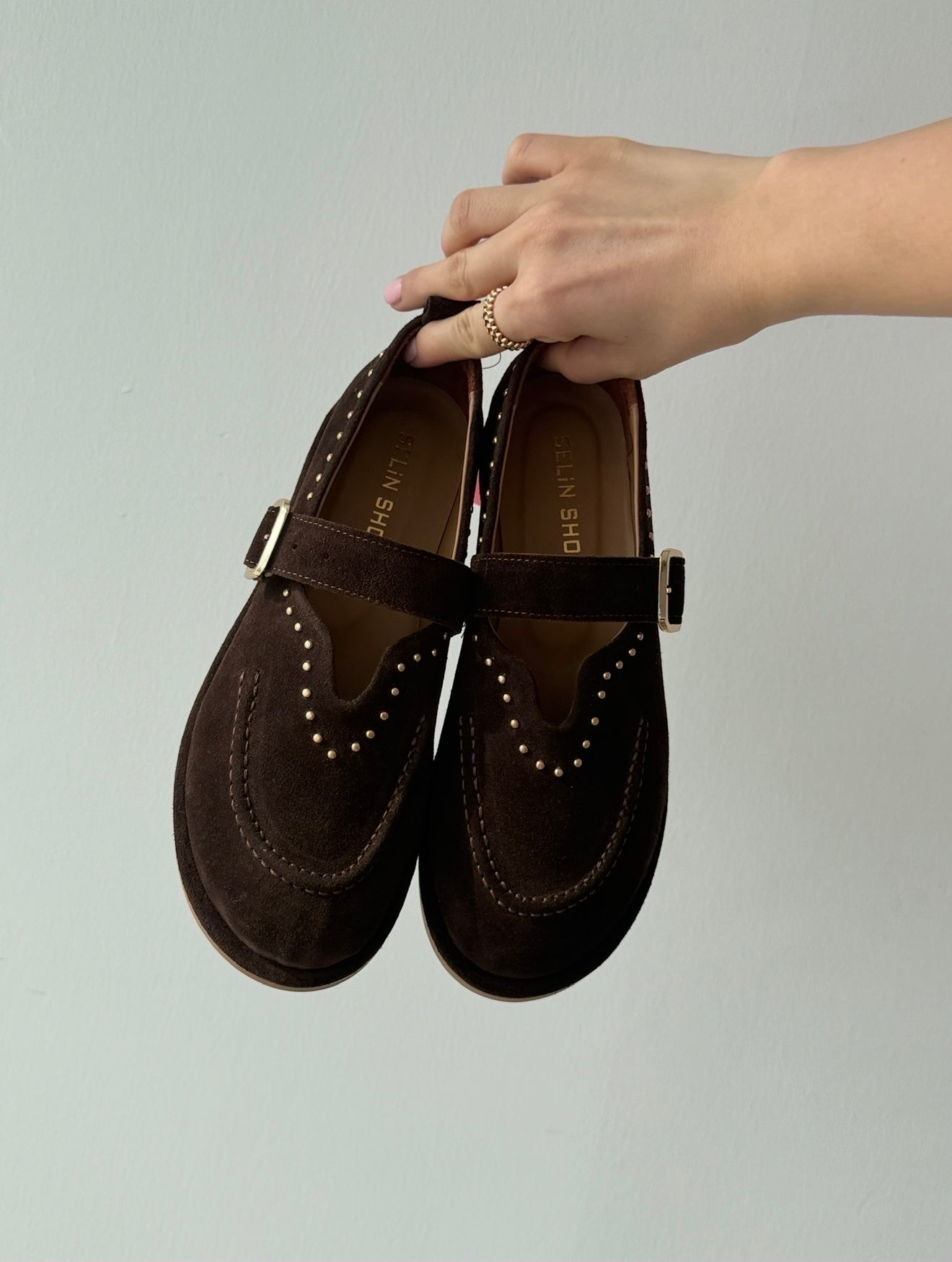 Alvora Hakiki Deri Ön V Kesim Gold Toka Detaylı Kadın Ayakkabı- KAHVE SÜET ( 0488 )