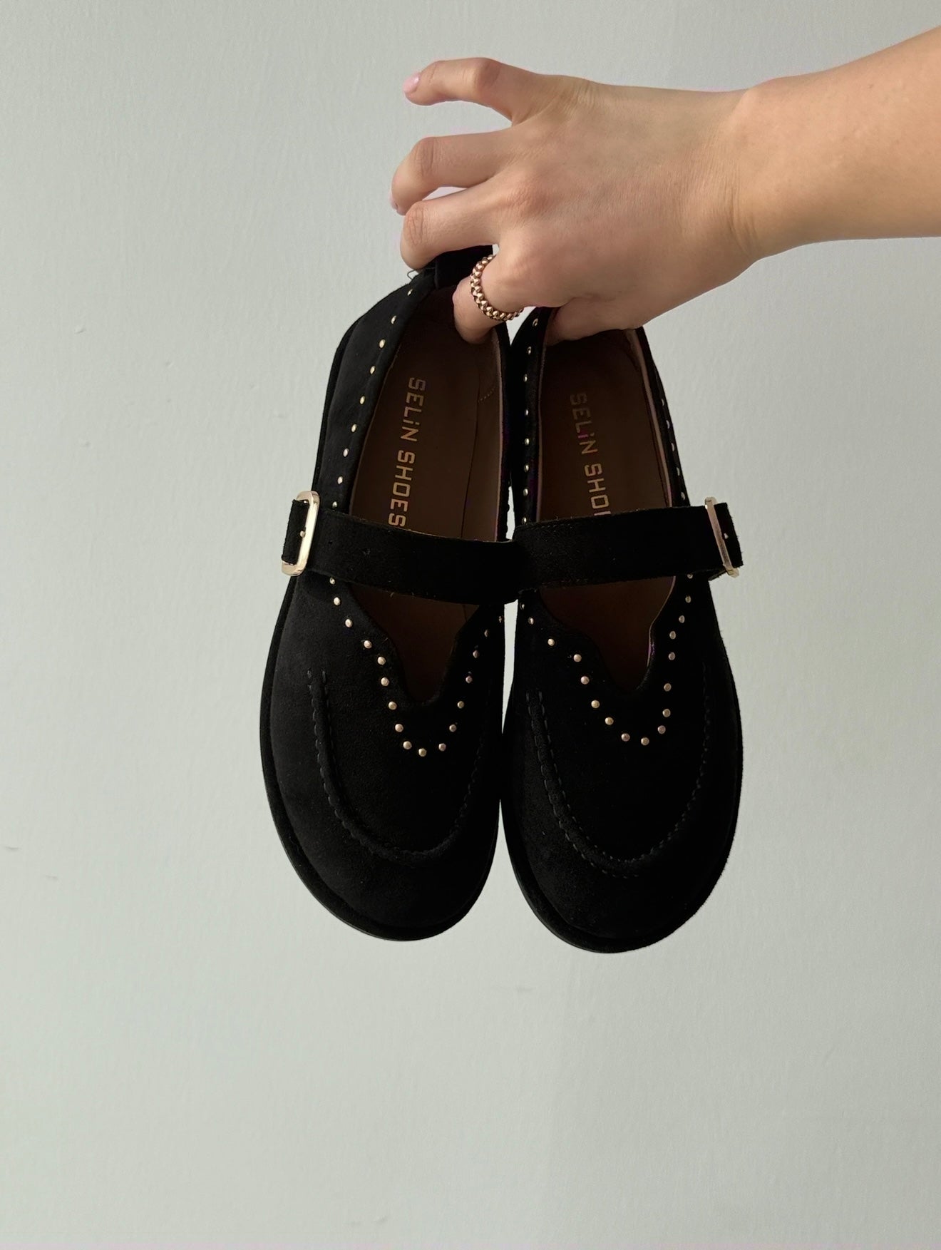 Alvora Hakiki Deri Ön V Kesim Gold Toka Detaylı Kadın Ayakkabı- SİYAH SÜET ( 0488 )