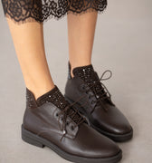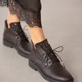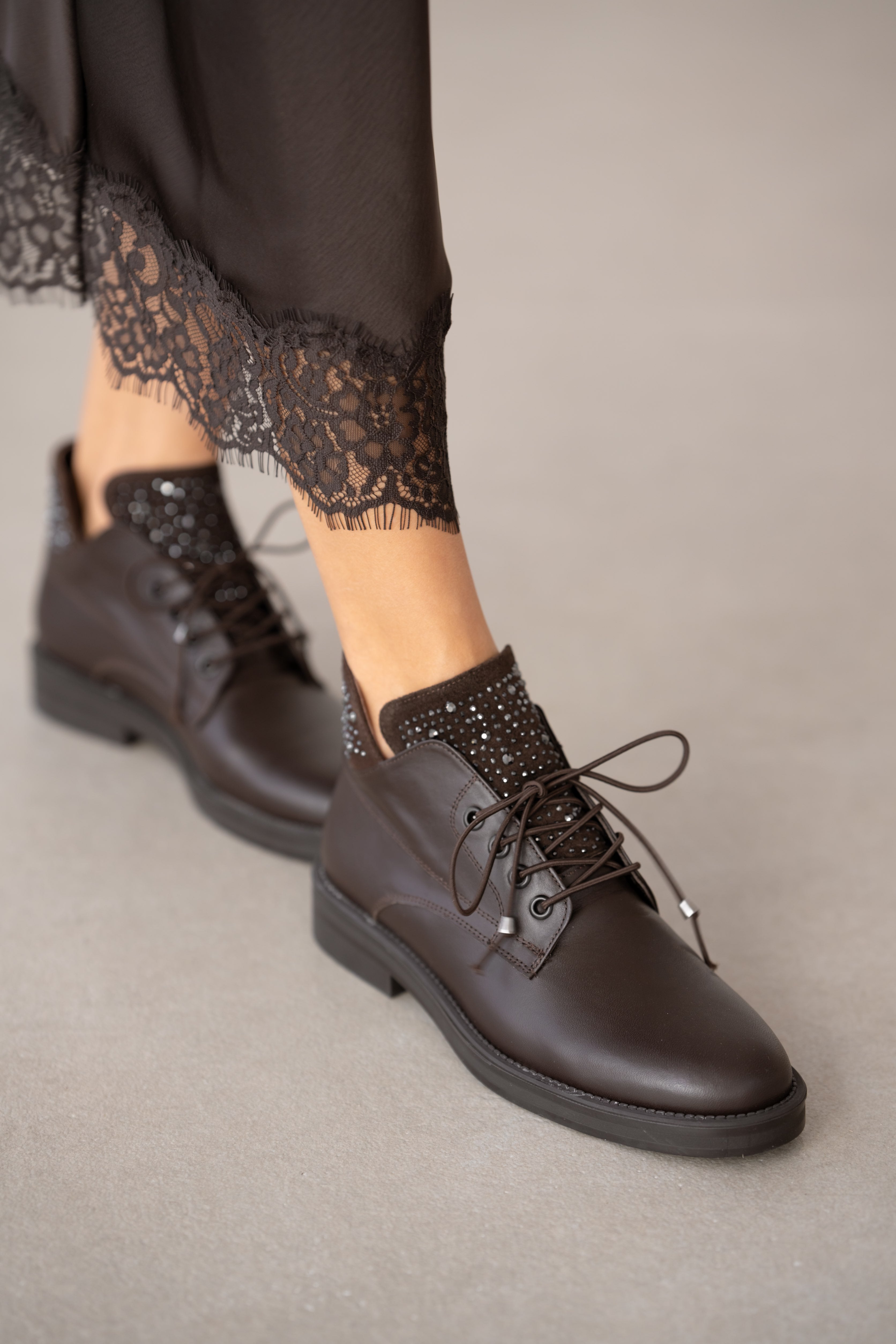 Navin Hakiki Deri Taş Detaylı Bağcıklı Kadın Ayakkabı- ACI KAHVE