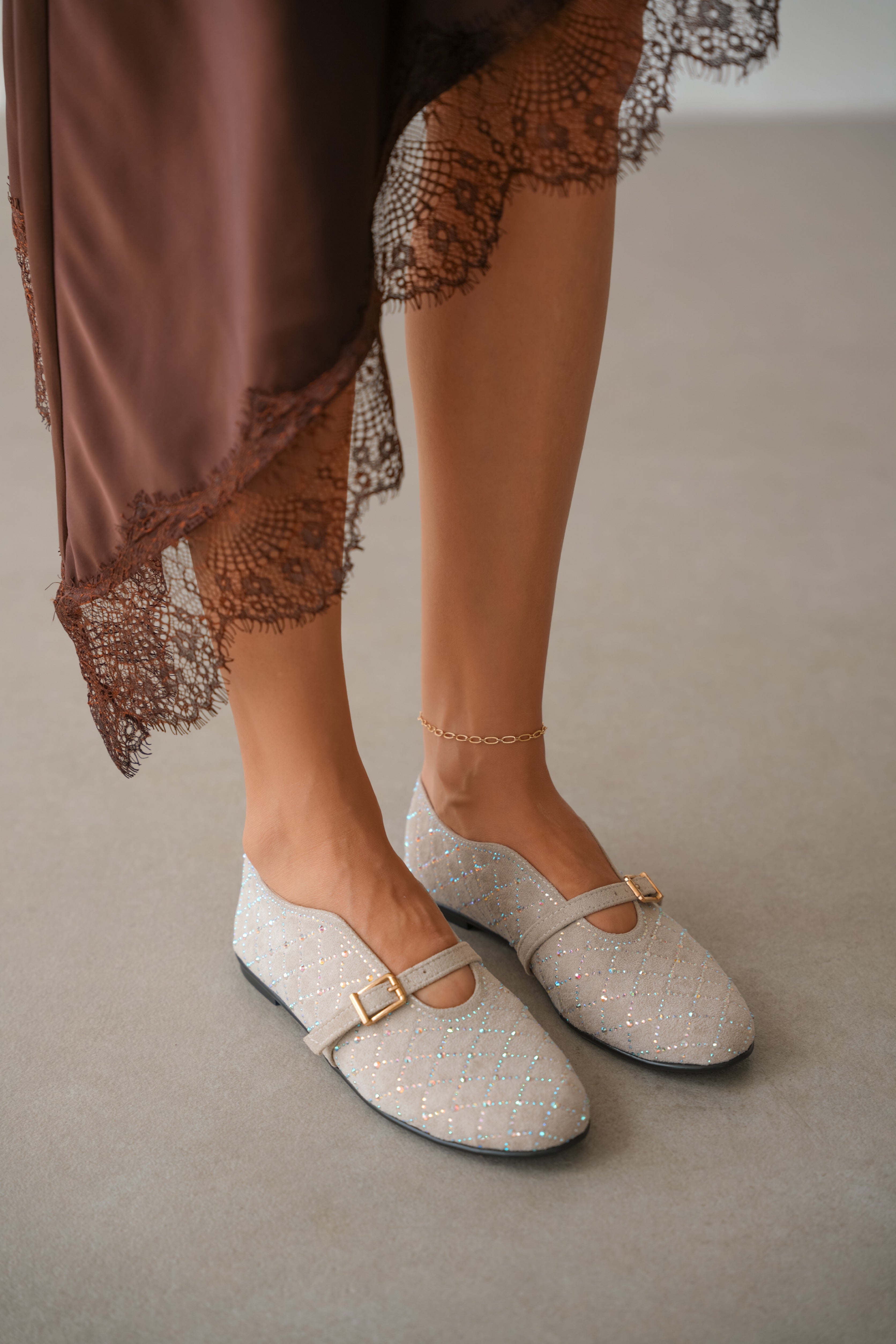 Lusira Kadife Kumaş Üzerine Parlak Taş Detaylı Kadın Babet- EKRU ( 0562 )
