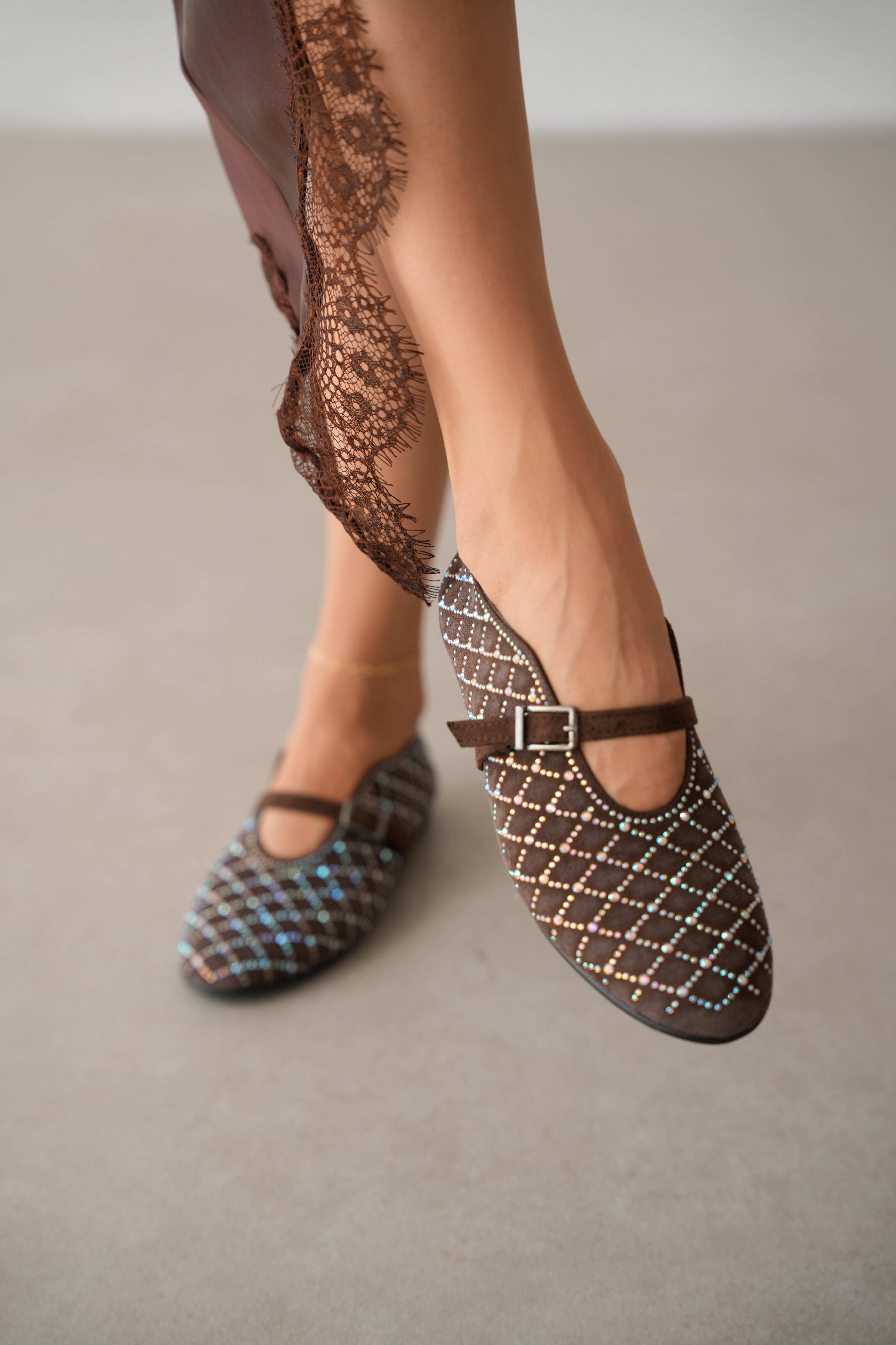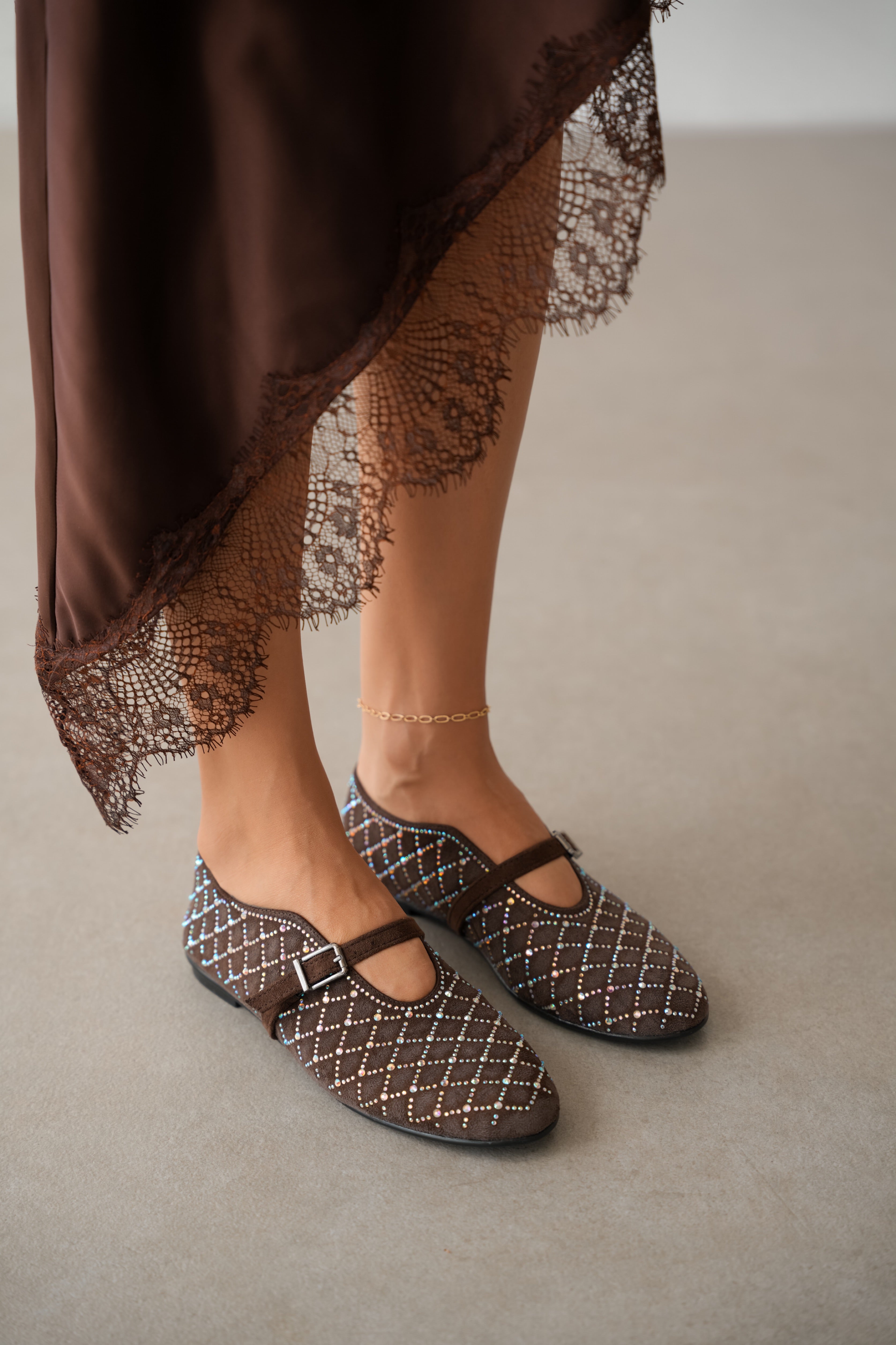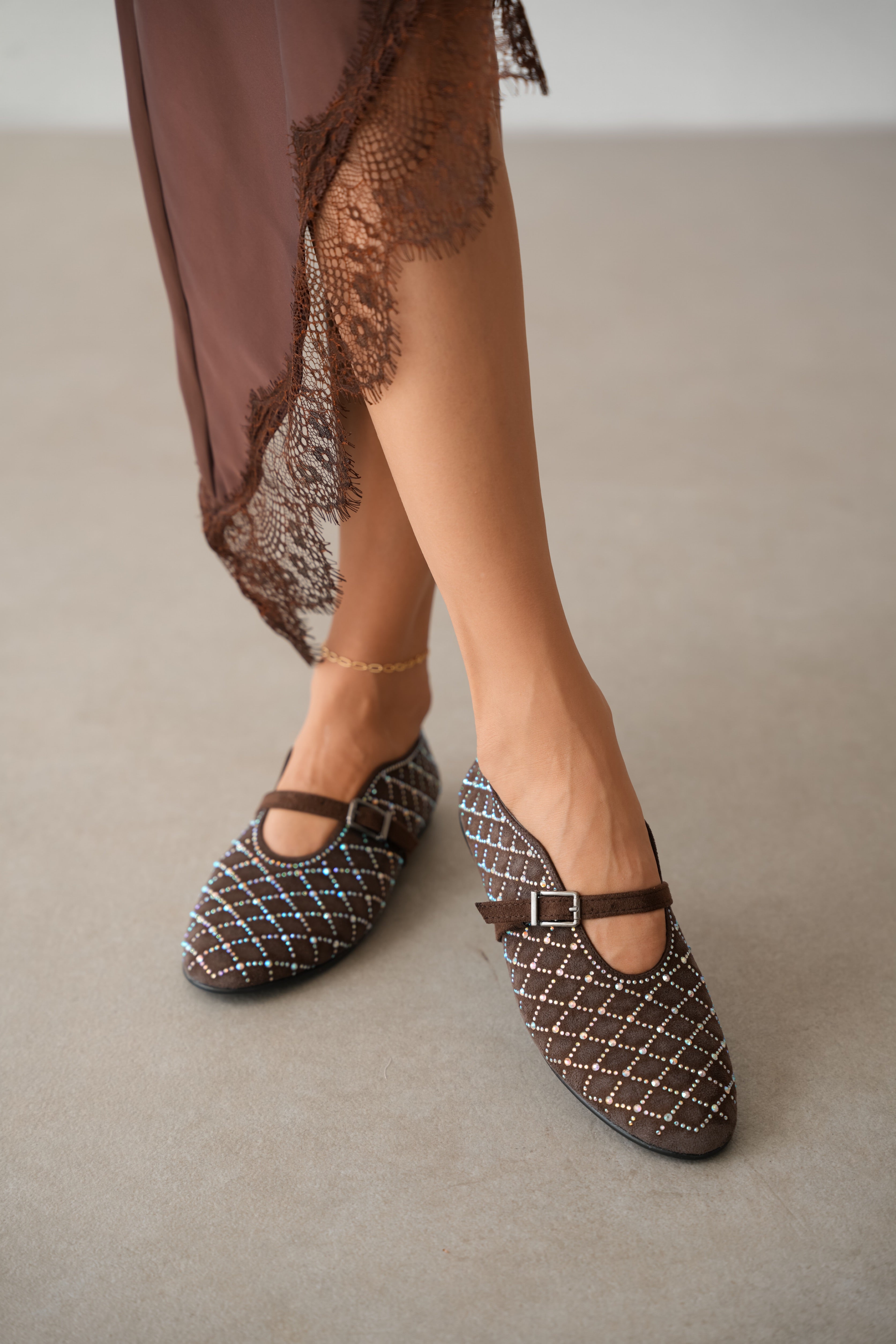 Lusira Kadife Kumaş Üzerine Parlak Taş Detaylı Kadın Babet- KAHVERENGİ ( 0562 )